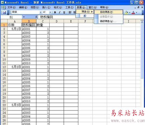 我們先給編碼排序,鼠標點到編碼這個框,然后數據--篩選--自動篩選,然后選擇升序排列。