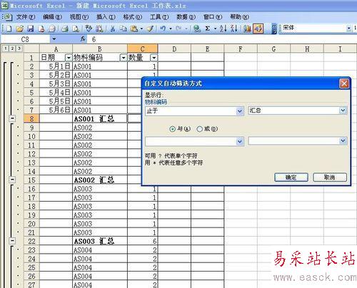 現在把我們需要的匯總信息提出來,篩選一下,選擇自定義--止于--匯總,這個操作是把帶有匯總兩個字的表格篩選出來,也就是我們要的匯總數據。