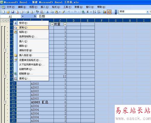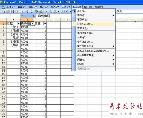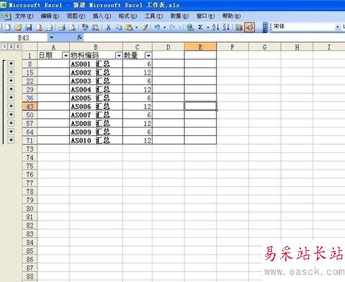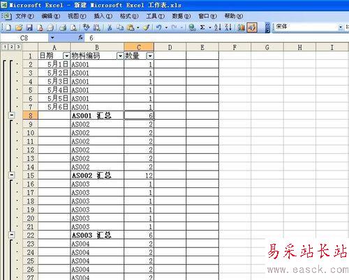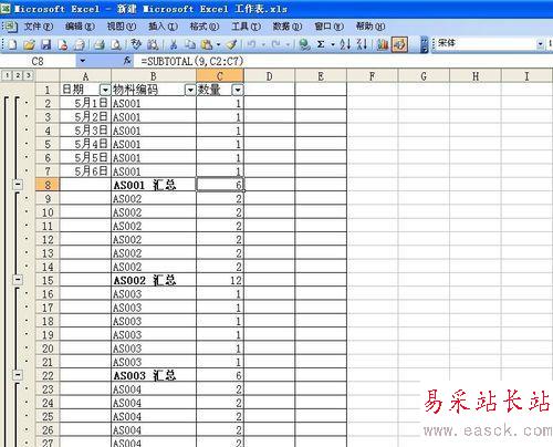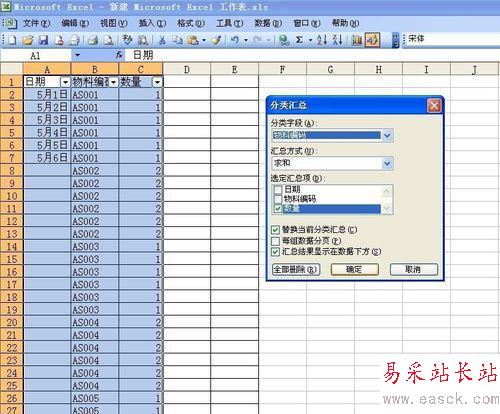 排列完了之后,我們發現同樣的編號的就被排到一起了,這就是我們要達到的目的,也是之后進行匯總的重要條件。然后,選擇數據--分類匯總,對話框“分類字段”里面選擇物料編碼這一項,做求和,匯總項是數量。