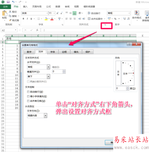 單擊“對齊方式”右下角的箭頭,彈出設(shè)置對齊方式的設(shè)置框。