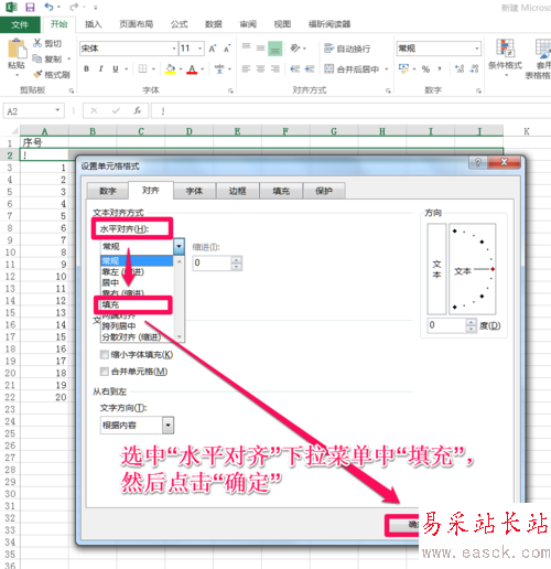 選中”水平對齊“下拉菜單中的”填充“,然后點(diǎn)擊”確定“。