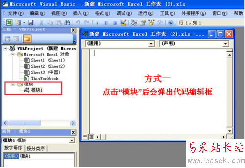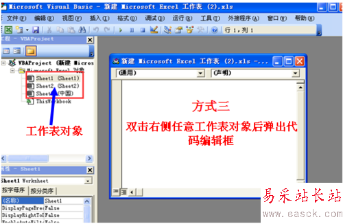 (說明一下:方式一打開的窗體沒有默認對象,程序編寫時如果要處理工作表或工作簿的數據,必須指明對象,如:對sheet2工作表的單元格進行處理,那么這樣寫sheet2.cells或sheets(2).cells;方式二和方式一打開的一樣,需要指明程序處理的對象;方式三打開的代碼框是默認的,也可以重新指定對象,如:雙擊sheet1工作表,那么在對應的代碼框中如果不指定對象,默認對應的是sheet1工作表。)