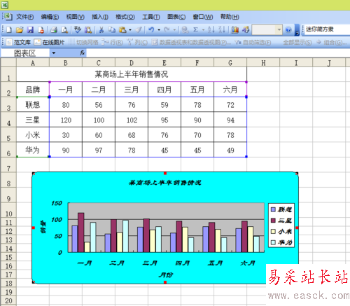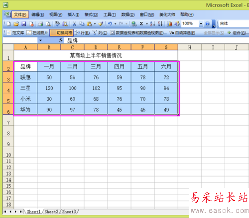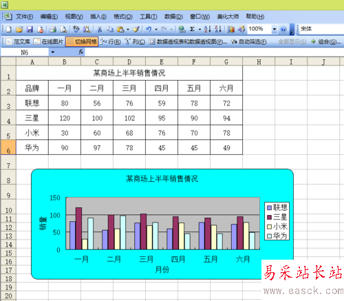 1、首先在我們制作出我們需要的表格,第一步選中數據,不要選擇“某商場上半年銷售情況“這一單元格,因為它是已經合并了的。
