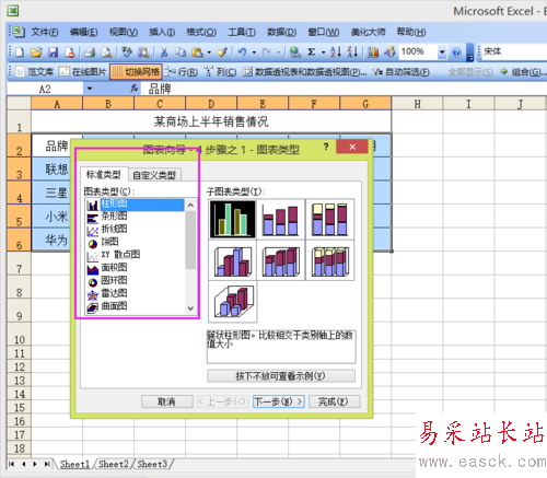 2、接下來,選擇插入——圖表。這里面有非常多的圖表樣式,我們先選擇一個最簡單的柱形圖表,然后下一步。