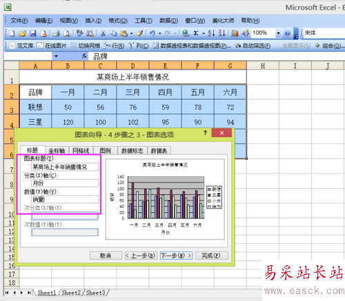 3、在圖表標題內輸入相應的標題,X軸為月份,Y軸為銷量,預覽效果會在右邊顯示出來。