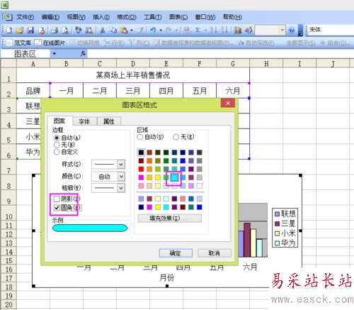 7、現在教大家修改圖表的樣式,雙擊圖表的空白區域,就會彈出一個對話框,可以設置圖表的背景色,改變圖表邊框等。如圖:所設置的圖表背景為藍色,圓角。