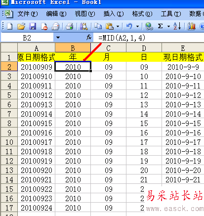 原始日期格式201009092、用MID() 函數分別取出年2010,月9,日9。