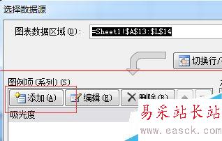 7、在“系列名稱”中選擇數(shù)據(jù)名稱,此圖為“吸光度”;“X軸系列值”和“Y軸系列值”中分別選擇需添加制作的數(shù)據(jù)。設(shè)置圖如下所示。