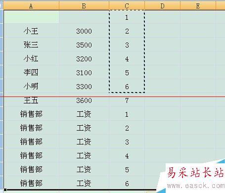 2、然后我們在C列依次輸入1234567,然后在C8:C13輸入123456,輸入完成之后將需要添加表頭的區域選上,如圖。