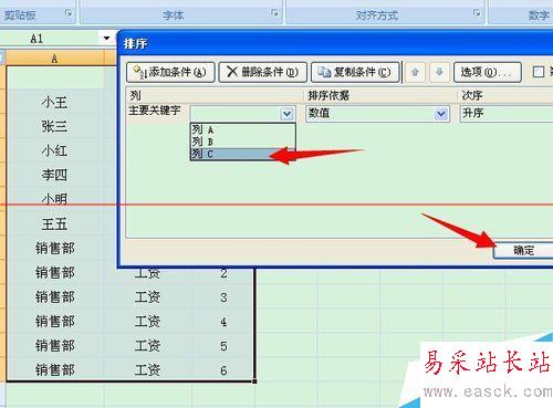 6、彈出之后會下拉選項,在下拉的選項里我們單擊“列C”選項,因為我們剛剛手動輸入的數字是在C列,所以我們單擊列C,單擊列C之后再單擊對話框上的“確定”按鈕。