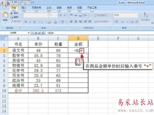 在首個商品金額單元格輸入等號“=”,點擊首個商品的“單價”,然后在商品金額單元格的單價(圖中B2)后輸入乘號“*”,再點擊再點擊首個商品的“數量”。