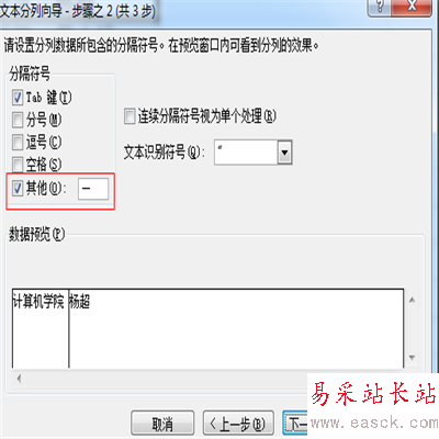 5、然后進入第二個對話框,注意如下圖所示填寫,在分隔符中選擇"其他",并填入符號"-",然后點擊"下一步"進入第三個對話框,這時候我們點擊"完成",可以看出我們完成了數據的分列