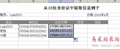 回車后,你會發現在C5單元格內已經出現了出生日期。然后,選中該單元格后拖動填充柄,其它單元格內就會出現相應的出生日期。