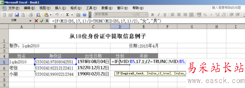 18位的新一代身份證了,里面的數字都是有規律的。前6位數字是戶籍所在地的代碼,7-14位就是出生日期。第17位“2”代表的是性別,偶數為女性,奇數為男性。我們要做的就是把其中的部分數字利用了涵數“提取出來”。