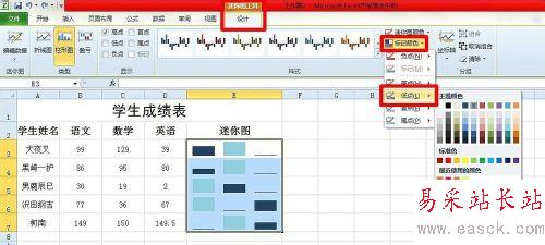 5、選擇“迷你圖工具”下的“設計”選項卡,單擊“標記顏色”按鈕,在彈出的菜單中選擇“高點”項,單擊自己喜歡的顏色,如圖。