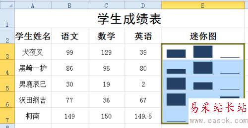 4、迷你圖顯示出來了,把鼠標放在單元格E3的右下角,當光標變成黑色十字形時,往下拖拽至單元格E7處,如圖。