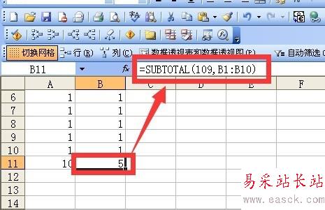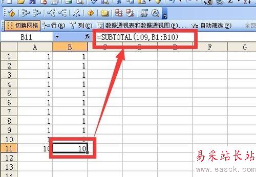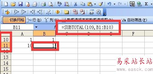 b11單元格中的函數(shù)是這樣設(shè)置的=subtotal(109,B1:B10),它的作用是對第二個參數(shù)區(qū)域中除了隱藏區(qū)域求和。