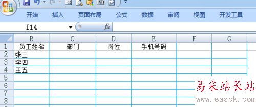 在第一行從A1起分別輸入員工姓名、所屬部門、崗位、手機號碼等項目;