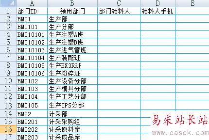 在第一行A1起分別輸入部門ID、領料部門、領料人、領料人手機等項目;