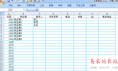 在A1中輸入供應商代碼;B1中輸入供應商名稱;C1中輸入聯系人;D1中輸入手機號碼;E1中輸入聯系電話;F1中輸入傳真;G1中輸入QQ號碼;H1中輸入聯系地址等項目;