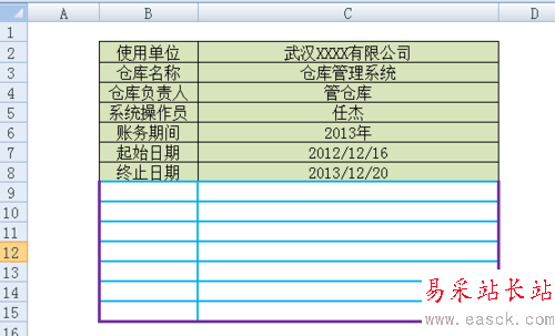 B2輸入使用單位;B3輸入倉庫名稱;B4輸入倉庫負責人;B5系統操作員;B6輸入賬務時間;B7輸入起始日期;B8輸入終止日期等項目;