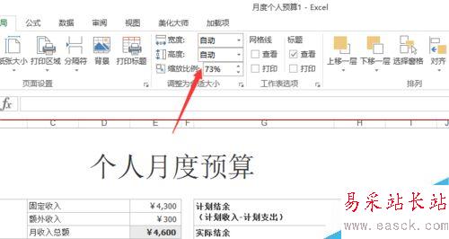 8、也可以在【頁(yè)面布局】選項(xiàng)卡,【調(diào)整為合適大小】欄中選擇【縮放比例】來(lái)控制打印內(nèi)容,效果跟【將工作表調(diào)整為一頁(yè)】差不多,只不過(guò)這樣設(shè)置更靈活,可以在一張紙上打印出不同的效果。【縮放比例】越小,一張紙上打印的內(nèi)容就越多。