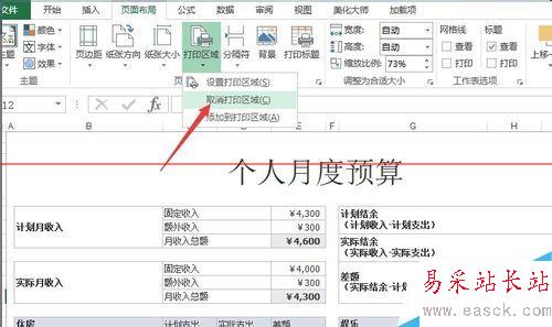 2、單擊【頁(yè)面布局】,選擇【頁(yè)面設(shè)置】中的【打印區(qū)域】,選擇【取消打印區(qū)域】