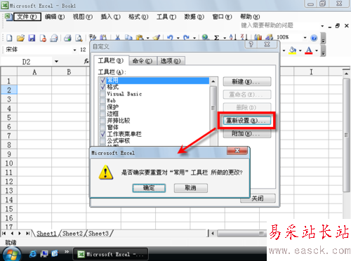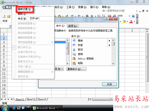 如果要恢復默認的設置,可以在菜單欄右鍵菜單選擇“重新設置”,“自定義”對話框的“工具欄”選項卡的“重新設置”。