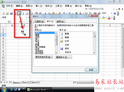 3、“自定義”對話框在“命令”選項卡時,可以拖動任意命令到菜單欄或者工具欄。
