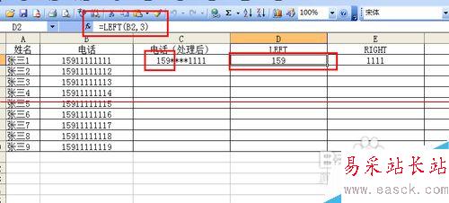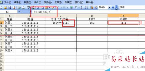 4、選中要顯示的單元格,輸入=CONCATENATE(LEFT(B2,3),"****",RIGHT(B2,4)),這里呢我們一共用到了三個函數(shù),CONCATENATE在上述步驟中已經(jīng)提及到了,主要起到了將幾個文本字符串合并為一個文本字符串,LEFT函數(shù)是根據(jù)所指定的字符數(shù)返回文本字符串中最左邊的一個或多個字符。RIGHT函數(shù)是根據(jù)所指定的字符數(shù)返回文本字符串中最右(后)邊的一個或多個字符。