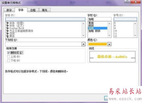 單擊“設置為”右側的箭頭,從下拉列表中選擇“自定義格式”命令,打開“設置單元格格式”對話框。在“字體”選項卡下依次設定字形為“加粗”,特殊效果為“刪除線”,顏色為“黃色”。