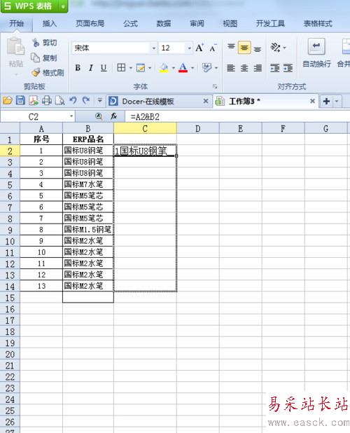 1、在C2中輸入公式=CONCATENATE(A2,B2)