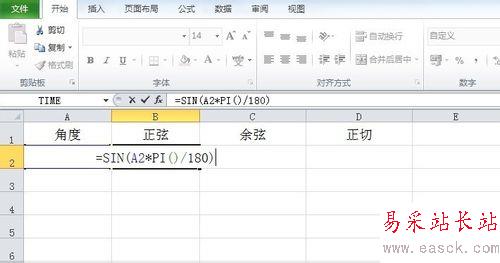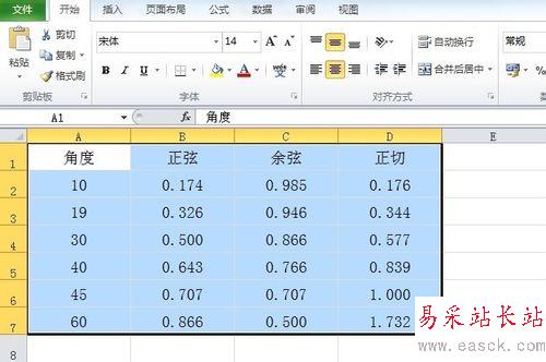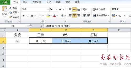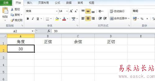 1、打開工作表,在A2單元格里輸入要計算的角度值,在B2,C2,D2單元格中分別輸入需要計算的三角函數。