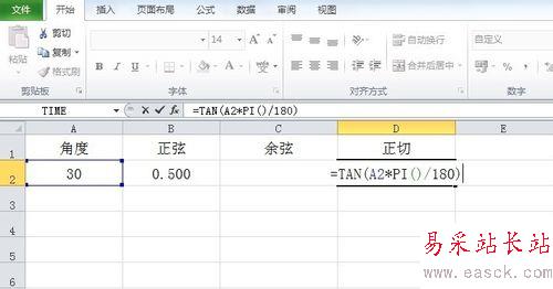 4、在D2單元格中輸入正切函數計算公式:=TAN(A1*PI()/180)