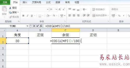 3、在C2單元格中輸入余弦函數計算公式:=COS(A1*PI()/180)