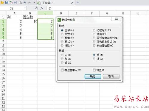 3、假設是A列,要剩固定數(10),先復制A列到C列空處白粘貼,然后復制固定數(10),最后選中C列那些數據單元格,右鍵,選擇性粘貼,勾選:剩 ,確定,即可,如圖下