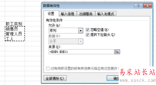 對話框出來后,設置有效性條件允許“序列”,數據來源為“銷售員,管理人員,工人”(中間間隔符號為英文標點符號)