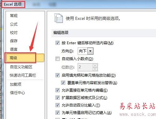 4、在彈出的“excel選項(xiàng)”窗口中,選擇“高級(jí)”。