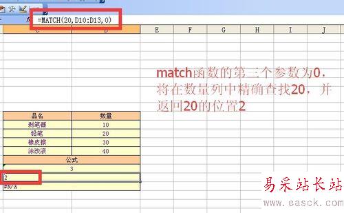 match函數(shù)的第三個參數(shù)為0,將在數(shù)量列中精確查找20,并返回20的位置2