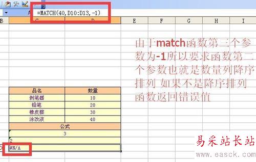 由于match函數(shù)第三個參數(shù)為-1所以要求函數(shù)第二個參數(shù)也就是數(shù)量列降序排列 如果不是降序排列 函數(shù)返回錯誤值