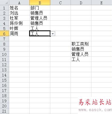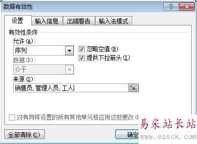 對話框出來后,設置有效性條件允許“序列”,數據來源為“銷售員,管理人員,工人”(中間間隔符號為英文標點符號)