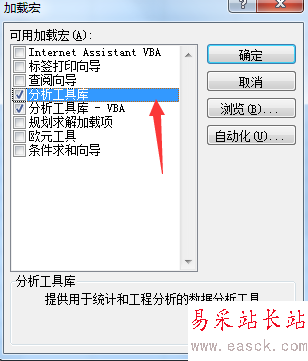 4、然后出現(xiàn)excel加載宏界面,在”分析工具庫(kù)“前方框內(nèi)打勾,點(diǎn)擊確定。
