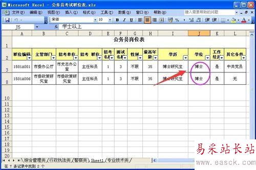 例如:我們給“學(xué)位”設(shè)置條件為博士。這時(shí),在工作表中就只顯示“博士”的數(shù)據(jù)列了。
