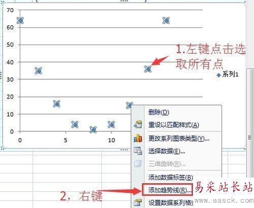 點擊一個點,會選中所有數據點,然后點右鍵,在彈出的菜單中選擇“添加趨勢線”。