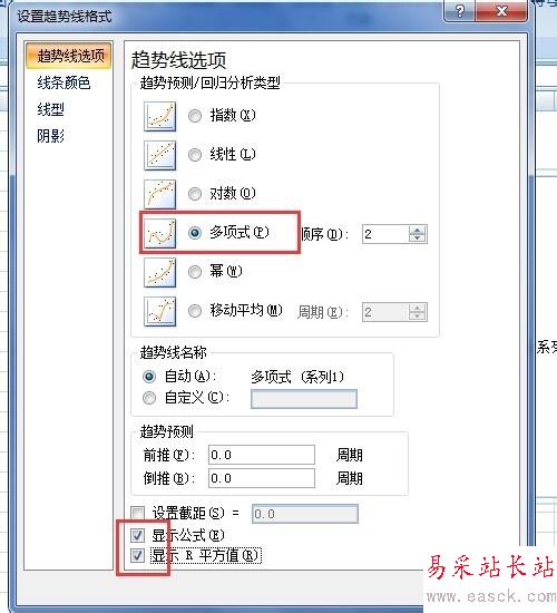 在這里可以選擇需要你和的曲線類型,如線性,指數,冪,對數,多項式。。選擇多項式。