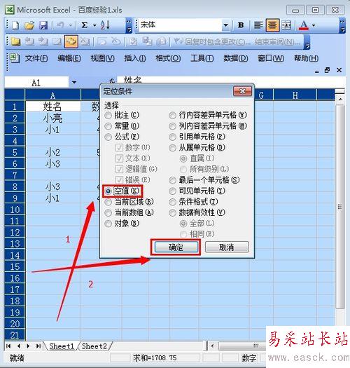 4、在定位條件設置窗口里點擊“空值” 然后點擊“確定” 如圖