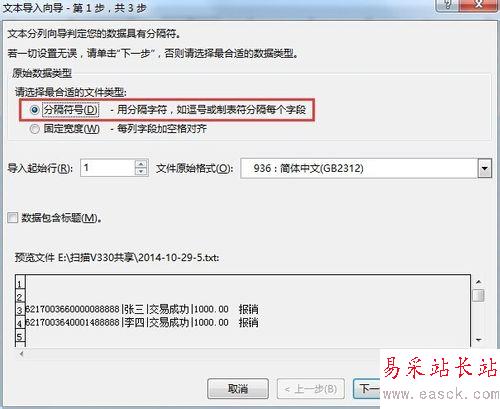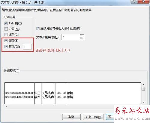 3、選擇分割符號(hào)。(建設(shè)銀行打款明細(xì)是用|和空格分割的,另外,每條記錄姓名長(zhǎng)度和打款金額長(zhǎng)度不一樣,因?yàn)椴荒苓x擇固定長(zhǎng)度。)