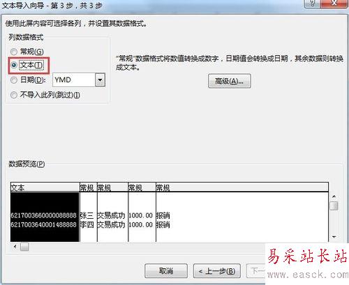 5、列數(shù)據(jù)數(shù)據(jù)格式選擇文本,點(diǎn)擊完成。(如果為常規(guī),卡號(hào)就會(huì)被當(dāng)作數(shù)據(jù)處理,會(huì)顯示科學(xué)計(jì)數(shù)法。)