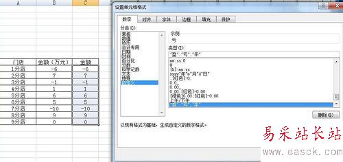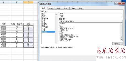 2、將金額列的數值復制到其右側的金額列,然后選中此列,點擊數字右側的小按鈕,打開設置單元格格式窗口,然后選擇數字選項,在分類下選擇自定義,在類型下的條形框中輸入“盈”;“虧”;“平”;