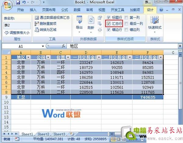 ④勾選設計選項卡中的匯總行,這樣表格下方就能看到匯總行了,便于之后的計算處理。